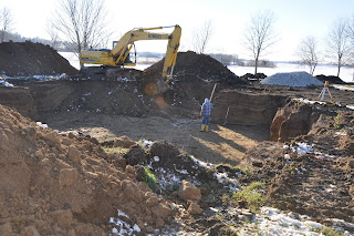 The first official digging day was January 7th 2013. They cut the temp driveway in (we need more rocks, 3 truck loads didn't even touch it) and dug our basement. Footers were placed on January 8th and concrete is going in today for those (January 9th)